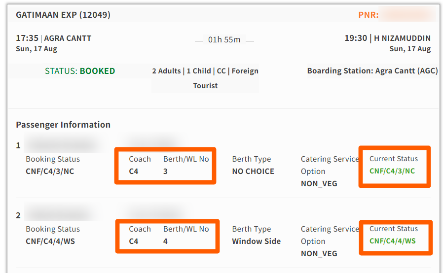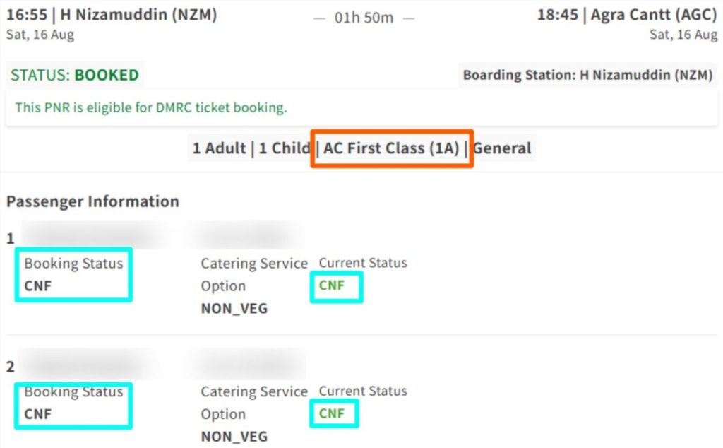 確認できるのは”CNF”という文字。これ、irctcのサイトによると、Confirmationということで、予約は完了しているよう。一方、調べてみると他の人は予約と同時に、崎背番号が割り当てられています。