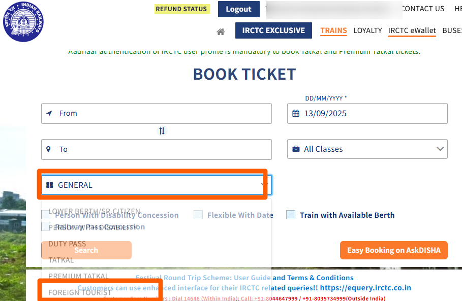 - 予約時は下記のようにGeneralで探して、席がなくなっていたらForeign tourist枠で探しましょう。Generalはキャンセルの時の手数料が少なくてすみます。